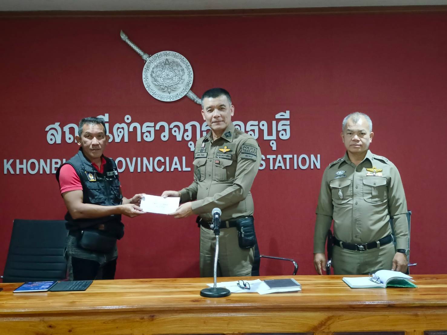 ในการนี้ได้มอบรางวัลผลการจับกุมยาเสพติดและอาวุธปืนให้แก่เจ้าหน้าที่ชุดสืบสวน และงานป้องกันปราบปราม ณ ห้องประชุม สภ.ครบุรี