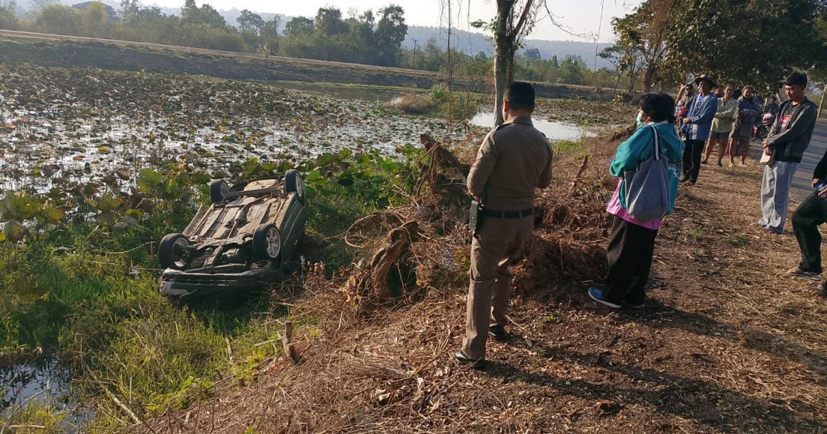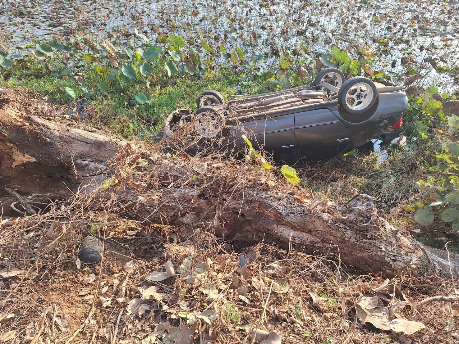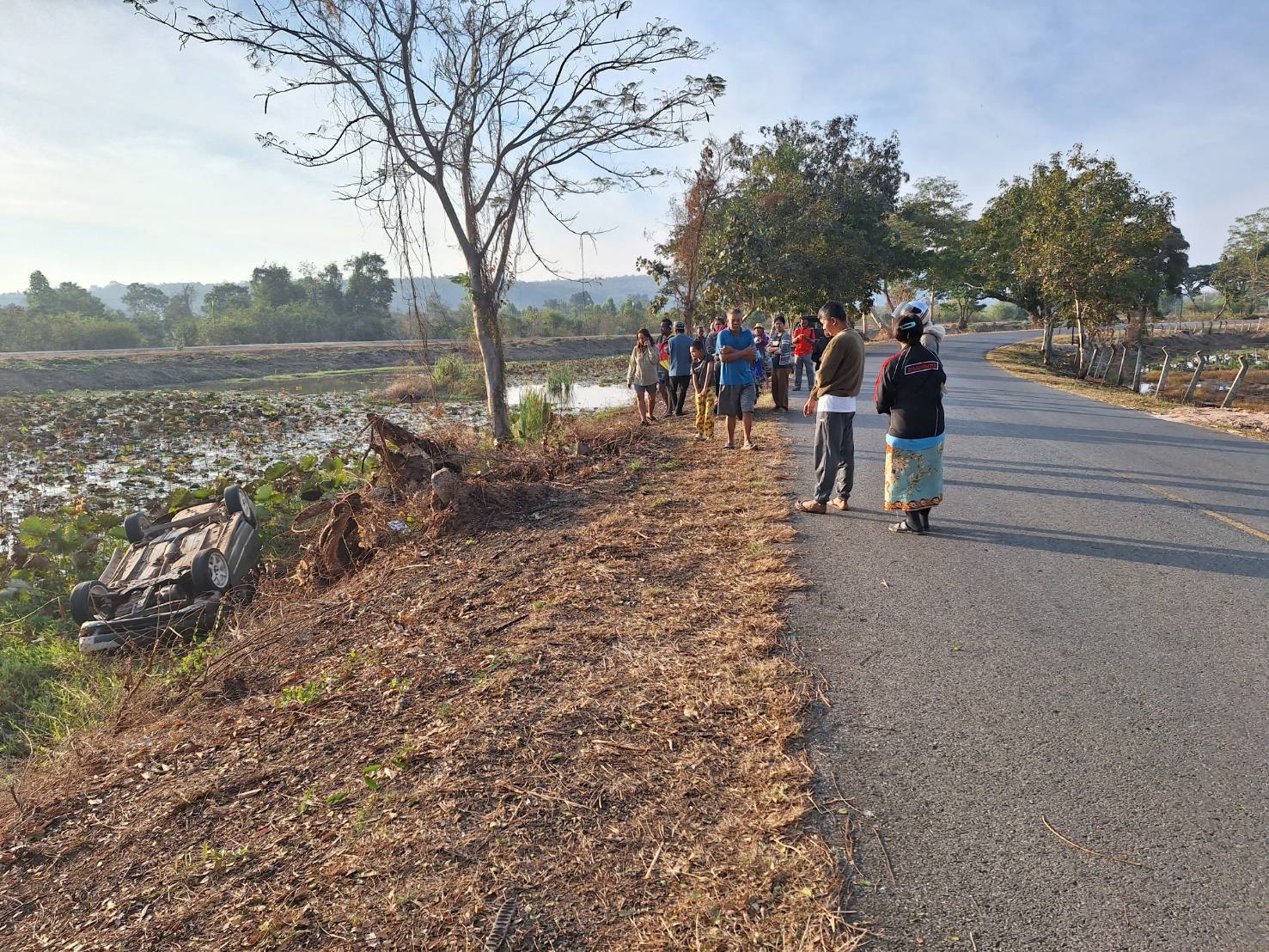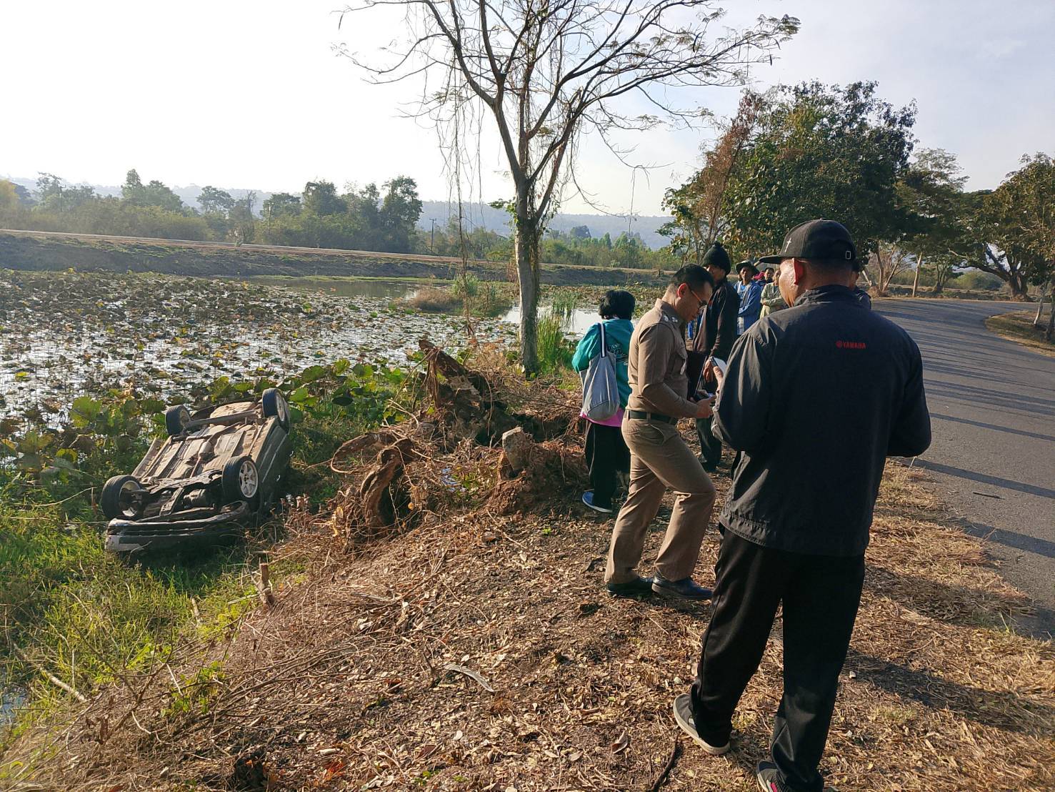 พนักงานสอบสวนออกตรวจที่เกิดเหตุ อุบัติเหตุรถยนต์พลิกคว่ำตกถนน