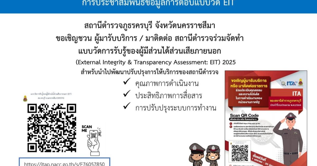 สถานีตำรวจภูธรครบุรี จังหวัดนครราชสีมา ขอเชิญชวน ผู้มารับบริการ / มาติดต่อราชการสถานีตำรวจ ร่วมประเมินแบบวัดการรับรู้ของผู้มีส่วนได้ส่วนเสียภายนอก (External Integrity and Transparency Assessment: EIT) สำหรับนำไปพัฒนาปรับปรุงการให้บริการของสถานีตำรวจ
