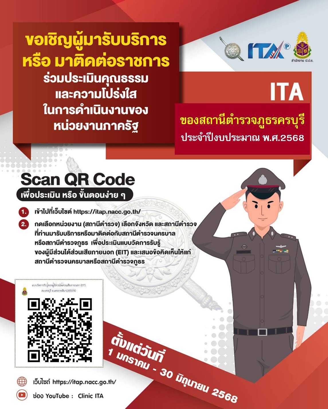 ขอเชิญชวนผู้มารับบริการหรือมาติดต่อราชการ ร่วมประเมินคุณธรรมและความโปร่งใสในการดำเนินงานของหน่วยงานภาครัฐ ของสถานีตำรวจภูธรครบุรี ประจำปีงบประมาณ พ.ศ.2568