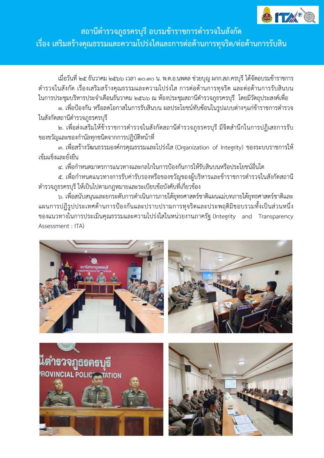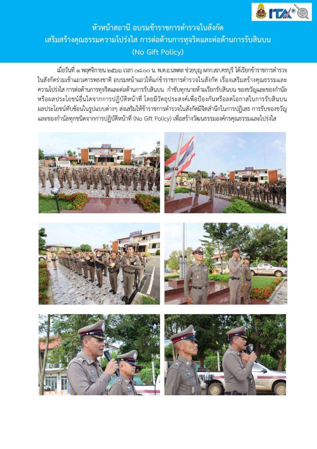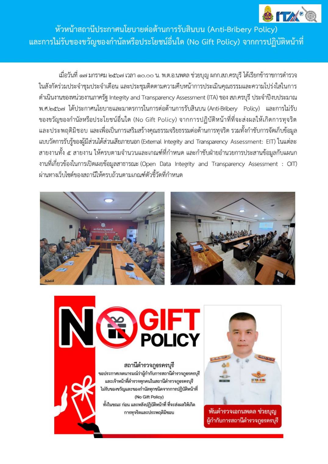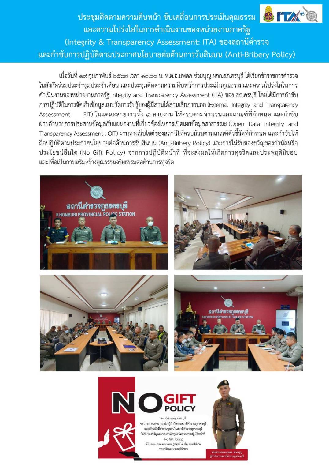 Home » มาตรฐาน ITA สภ.ครบุรี » มาตรฐาน ITA 2567 » การดำเนินการเพื่อป้องกันการทุจริต 2567 » O19 การมีส่วนร่วมของหัวหน้าสถานีตำรวจ