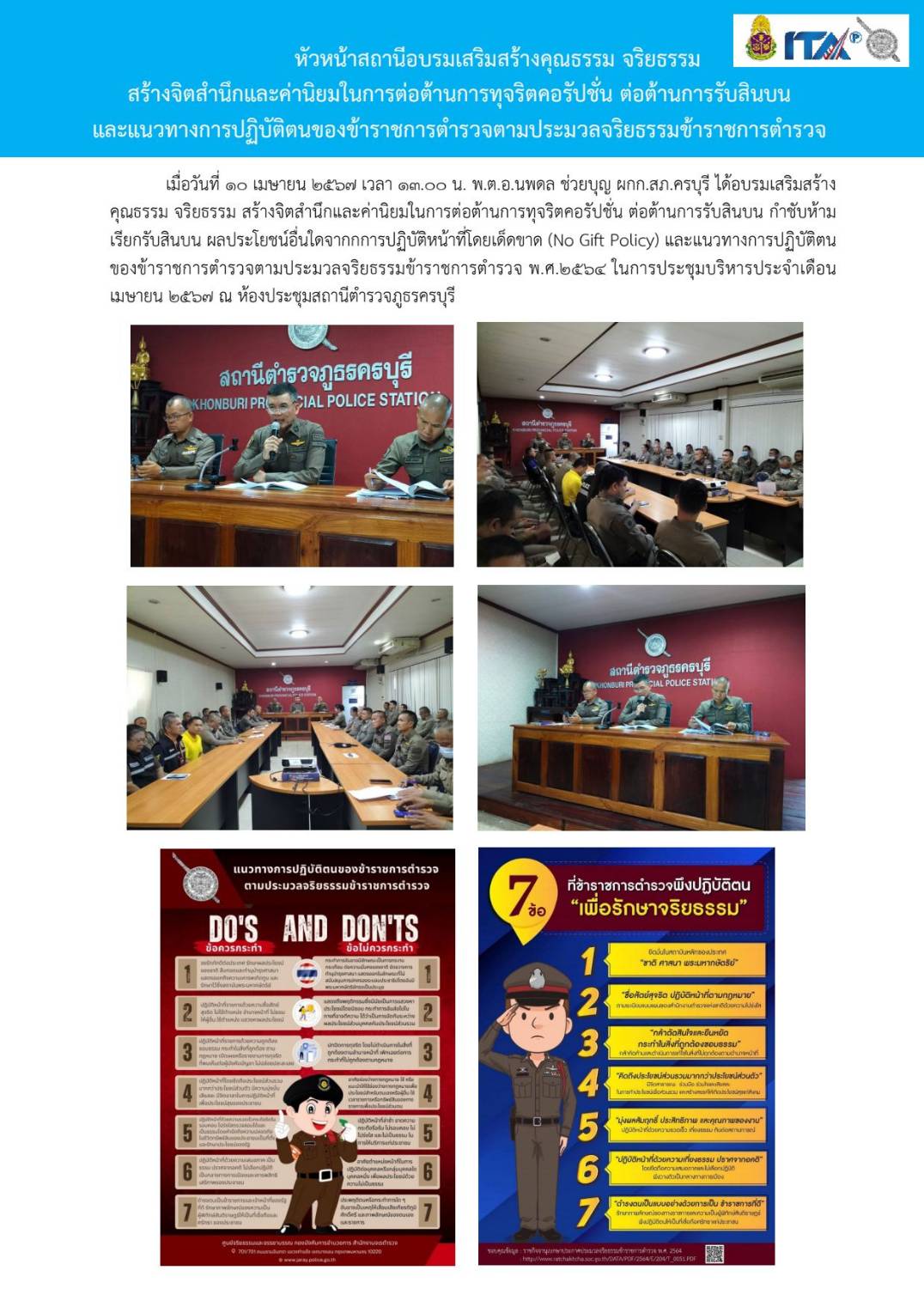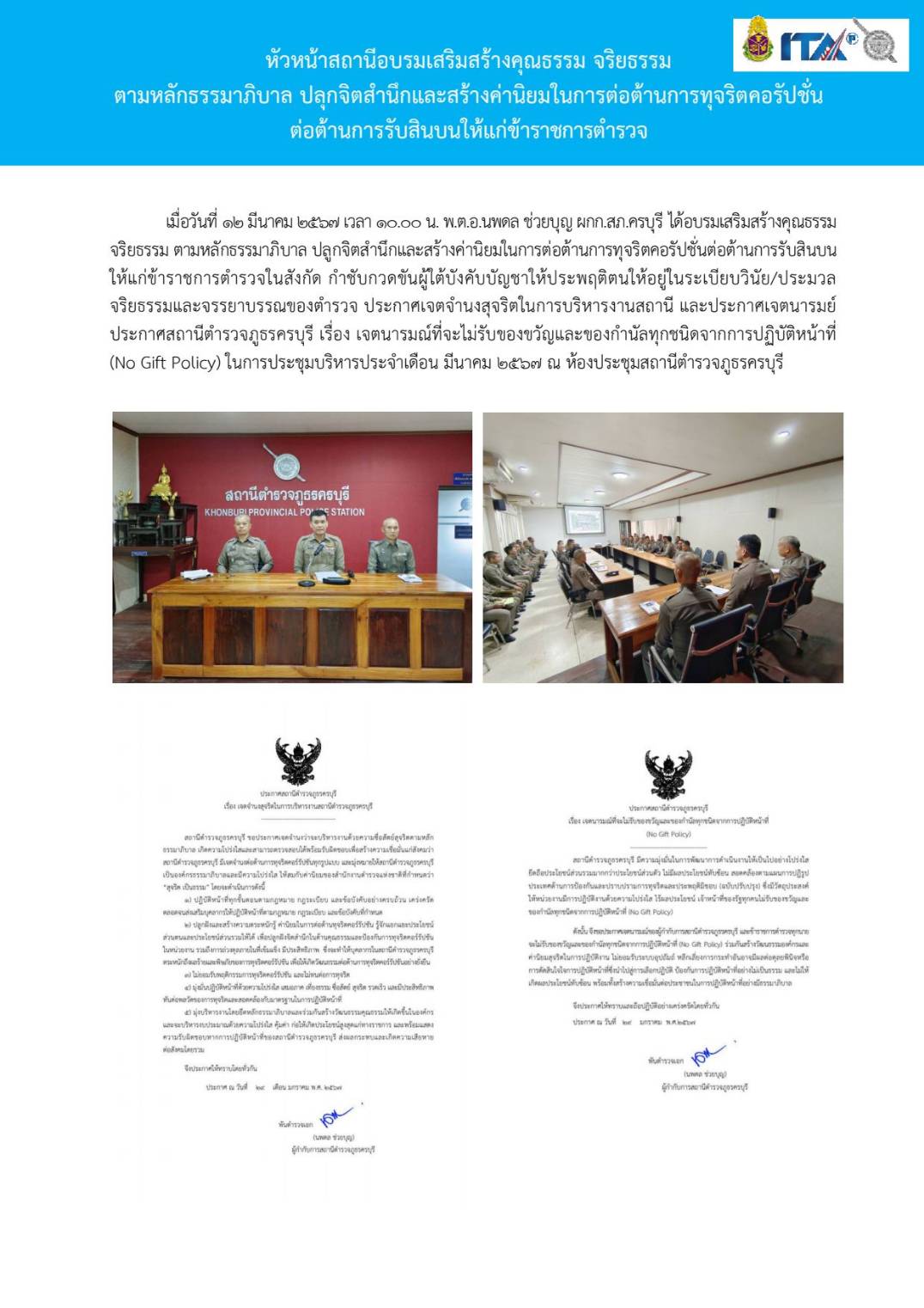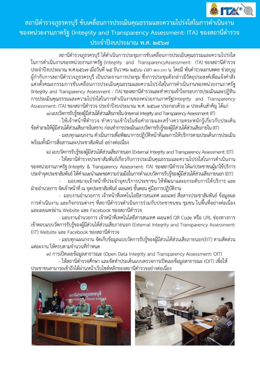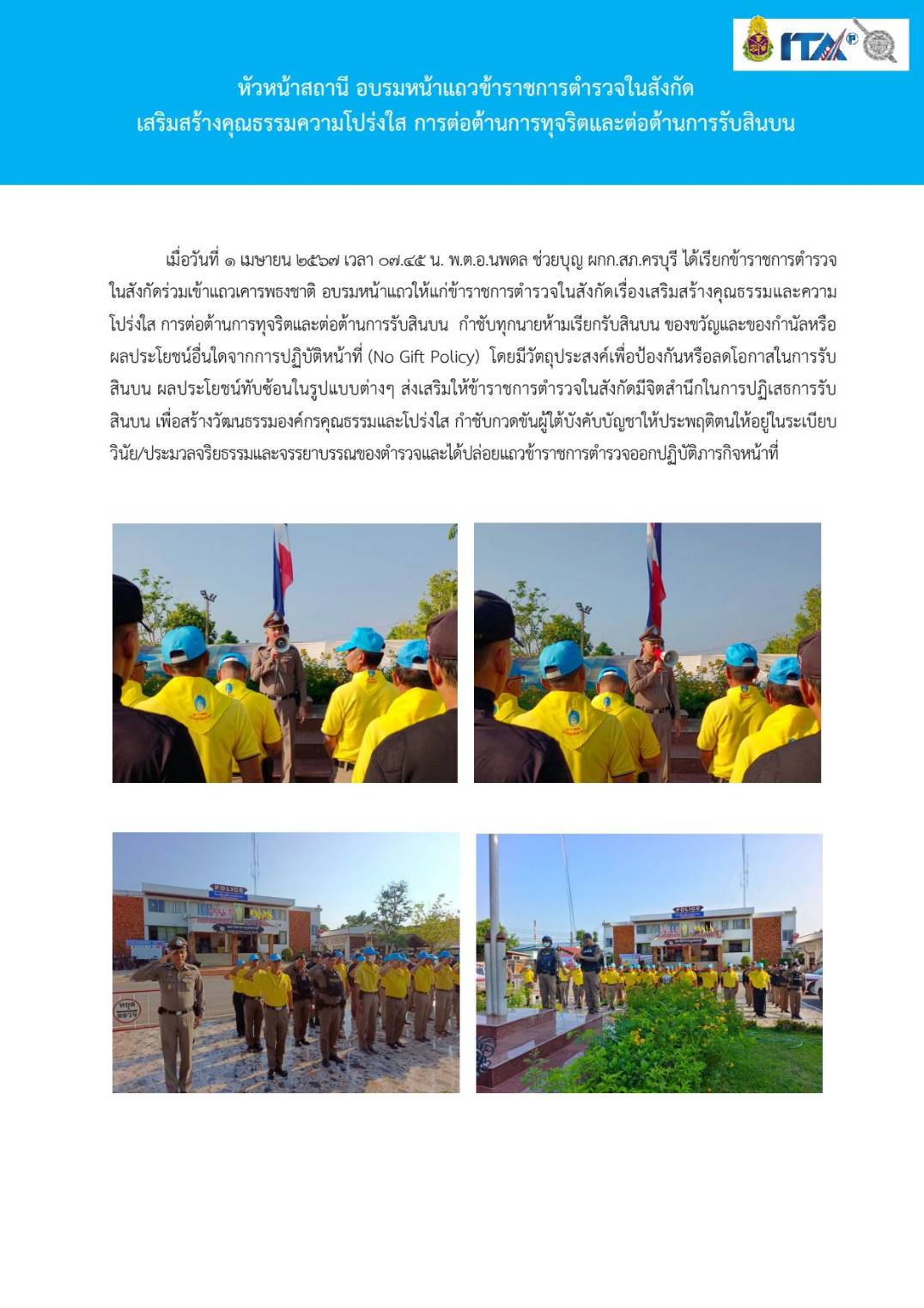 Home » มาตรฐาน ITA สภ.ครบุรี » มาตรฐาน ITA 2567 » การดำเนินการเพื่อป้องกันการทุจริต 2567 » O19 การมีส่วนร่วมของหัวหน้าสถานีตำรวจ