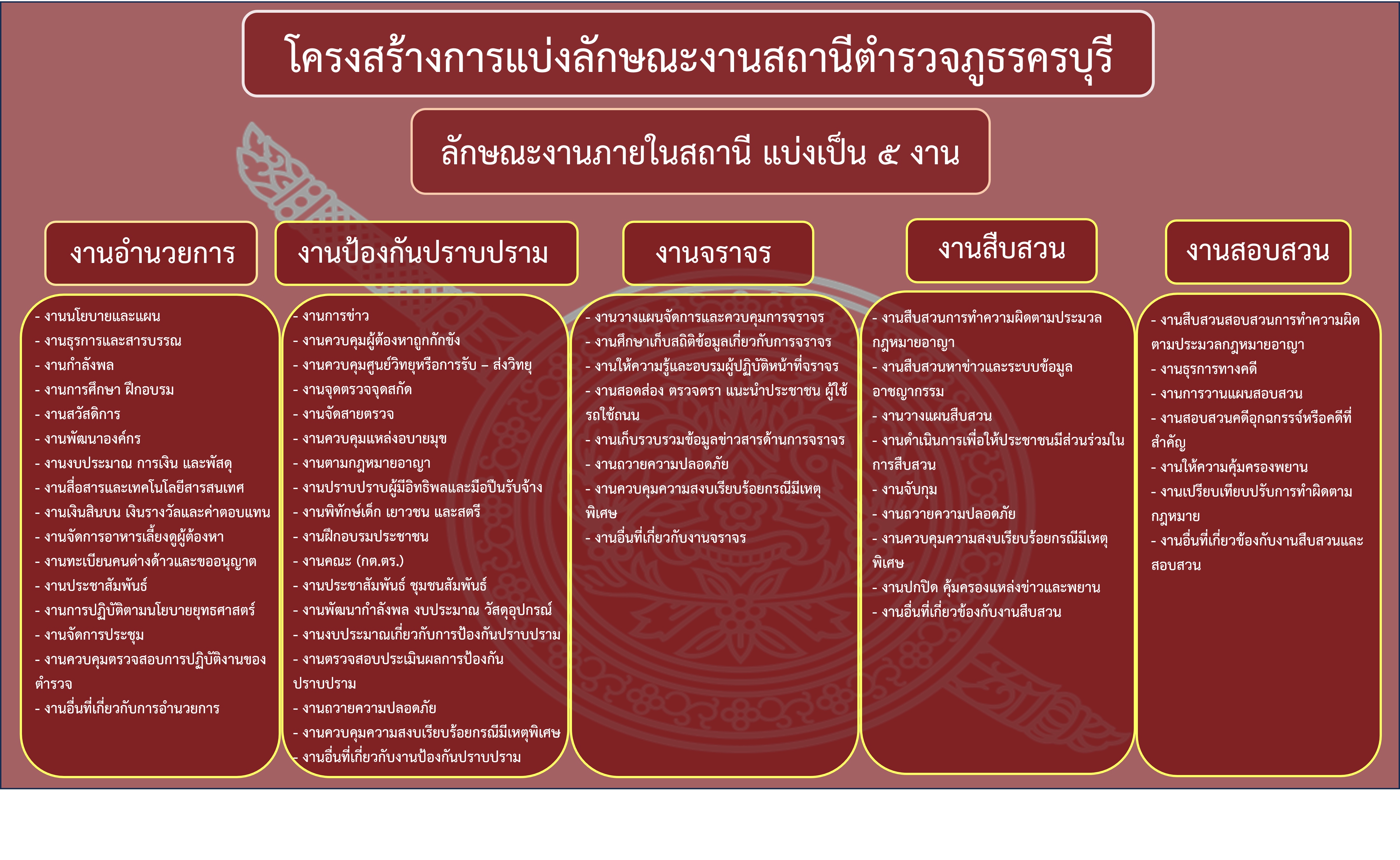 5) งานสอบสวน มีหน้าที่เกี่ยวกับการวางแผน อำนวยการ สั่งการ ควบคุม กำกับ ดูแล ตรวจสอบติดตามและประเมินผลด้านการสอบสวนคดีอาญา การมีความเห็น การให้ความเห็นชอบ หรือเป็นส่วนประกอบของงานนี้ เพื่ออำนวยความยุติธรรมให้แก่ประชาชนในการสืบสวนสอบสวนคดีอาญาให้บังเกิดประสิทธิภาพสูงสุดในเขตอำนาจการรับผิดชอบหรือพื้นที่ปกครองของสถานีตำรวจ