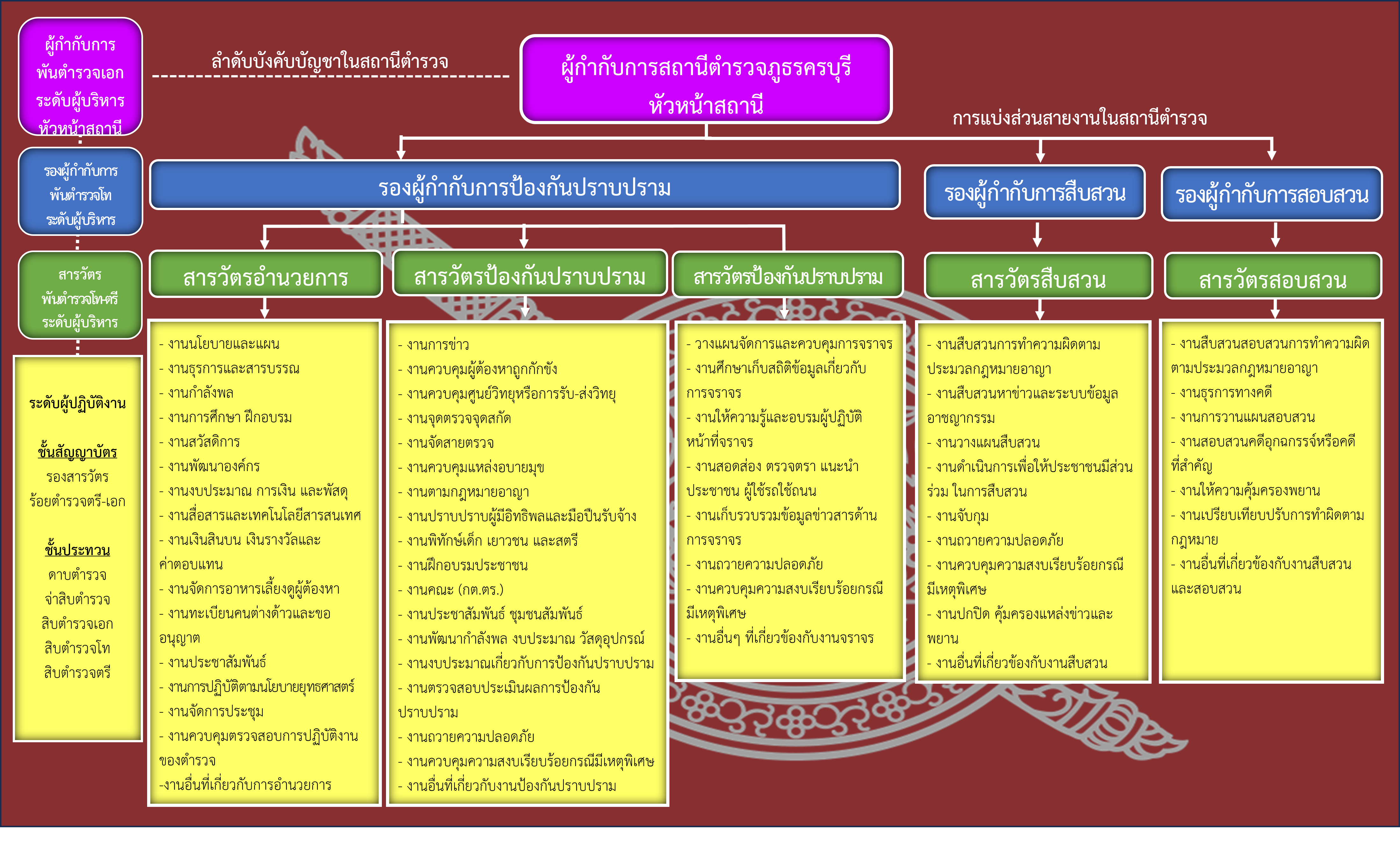 1) งานอำนวยการ มีหน้าที่เกี่ยวกับการอำนวยการ การวางแผน การตรวจสอบติดตามและประเมินผลงานที่เกี่ยวกับนโยบาย ยุทธศาสตร์ และแผนงานของสถานีตำรวจ งานการบริหารบุคลากร งานจเรตำรวจงานกิจการพิเศษ งานความมั่นคง การศึกษา การฝึกอบรม งานวิชาการ สวัสดิการ การพัฒนา การบริหารจัดการ งบประมาณ การเงิน การพัสดุ การพลาธิการและสรรพาวุธ การส่งกำลังบำรุง รวมทั้งลักษณะงานอื่น ๆ ที่เกี่ยวข้องหรือเป็นส่วนประกอบของงานดังกล่าว เพื่อส่งเสริมหรือสนับสนุนการปฏิบัติงานของสถานีตำรวจ