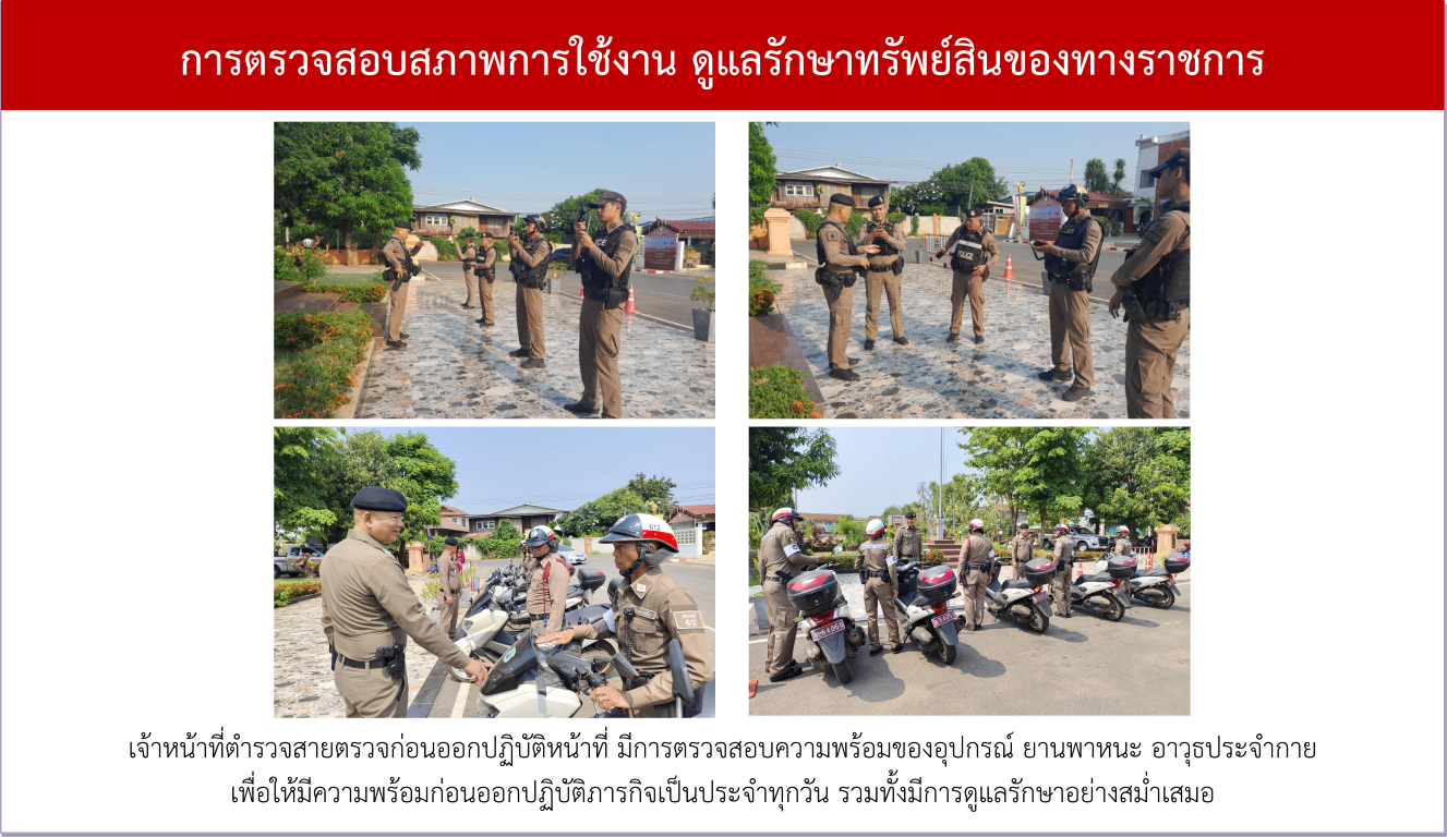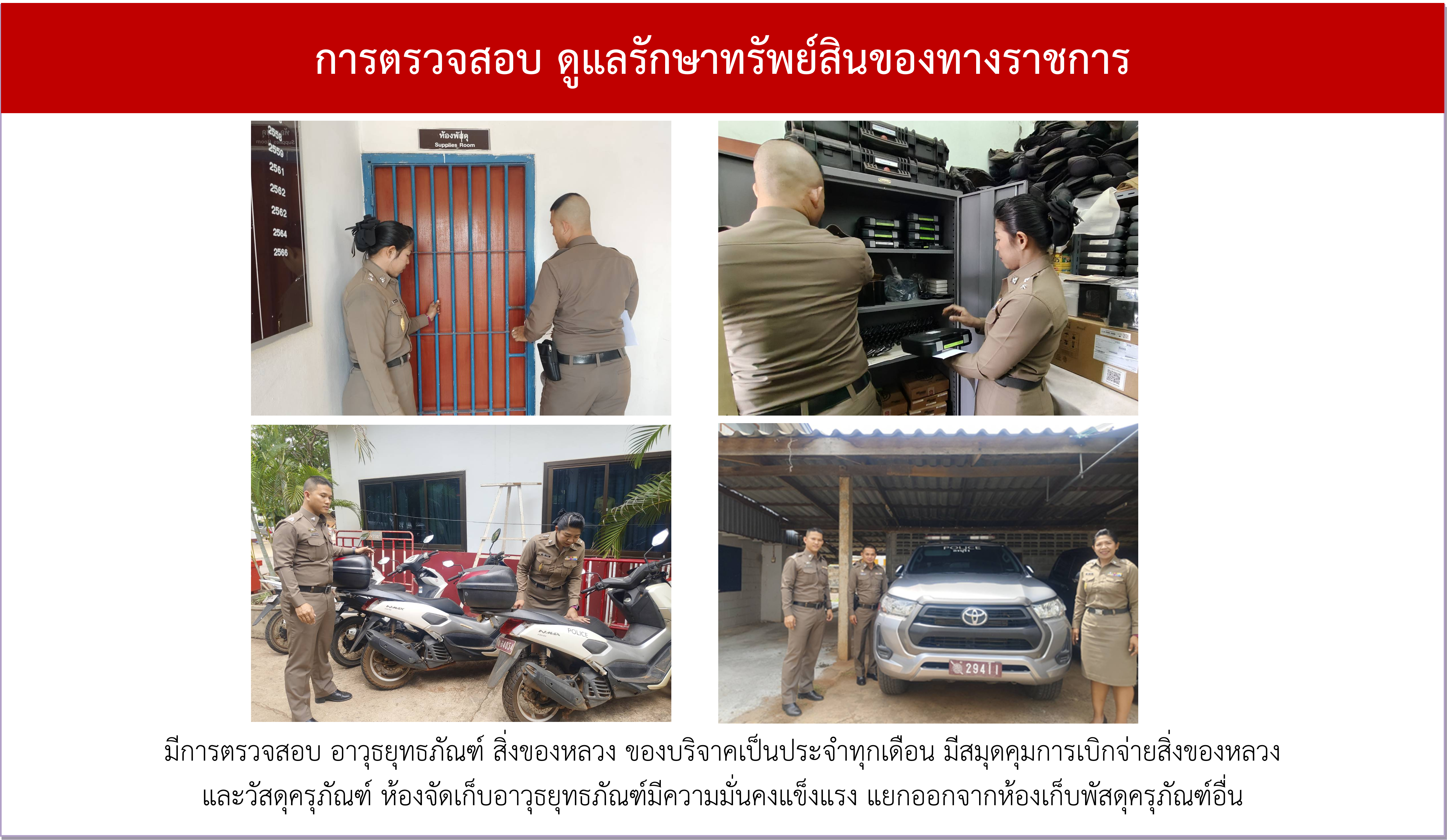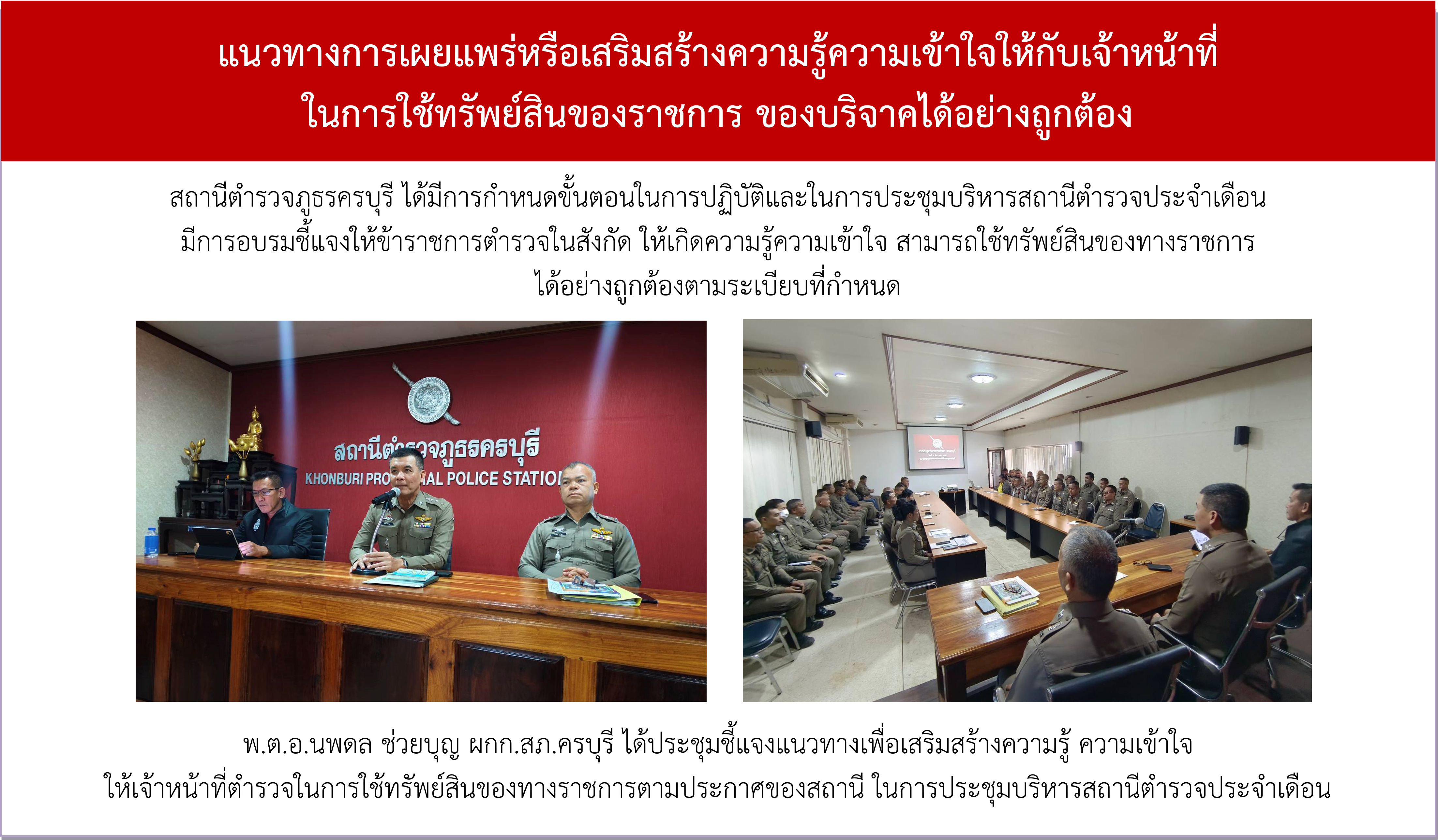 โดยได้มีการกำหนดแนวทางขั้นตอนในการปฏิบัติ และในการประชุมบริหารสถานีตำรวจประจำเดือน มีการอบรมชี้แจงให้ข้าราชการตำรวจในสังกัดให้เกิดความรู้ความเข้าใจ ศึกษา กฎ ระเบียบ ข้อกฎหมายที่เกี่ยวข้องเพื่อให้มีความรู้ความเข้าใจสามารถใช้ทรัพย์สินของราชการและของบริจาคได้อย่างถูกต้อง