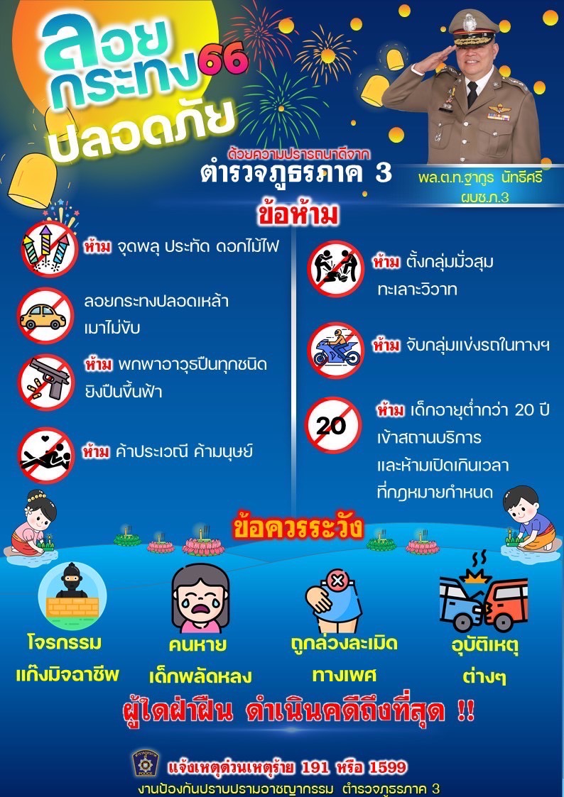 ห่วงใย ปลอดภัย ในเทศกาลลอยกระทง ปี 2566 24 พฤศจิกายน 2566 โดย admin / ข่าวประชาสัมพันธ์ ด้วยความห่วงใยจาก สภ.ครบุรี ในเทศกาลลอยกระทงมีเรื่องที่จะมาแนะนำพี่น้องทุกคน ดังนี้– ห้าม จุดพลุ ประทัด ดอกไม้ไฟ– ห้าม พกพาอาวุธปืนทุกชนิด– ห้าม ค้าประเวณี ค้ามนุษย์– ห้าม ตั้งกลุ่มมั่วสุม ทะเลาะวิวาท– ห้าม จับกลุ่มแข่งรถในทางฯ– ห้าม เด็กอายุต่ำกว่า 20 ปี เข้าสถานบริการ และห้ามเปิดเกินเวลาที่กฏหมายกำหนด– ดื่มแอลกอฮอล์ ไม่ควรขับรถหรือพาหนะต่าง ๆ ข้อควรระวัง !!!– การโจรกรรม แก๊งมจฉาชีพ– คนหาย เด็กพลัดหลง– ถูกล่วงละเมิดทางเพศ– อุบัติดหตุต่าง ๆสามารถแจ้งเหตุได้ที่ 191 หรือ 1599 FacebookFacebookXTwitterLINELine